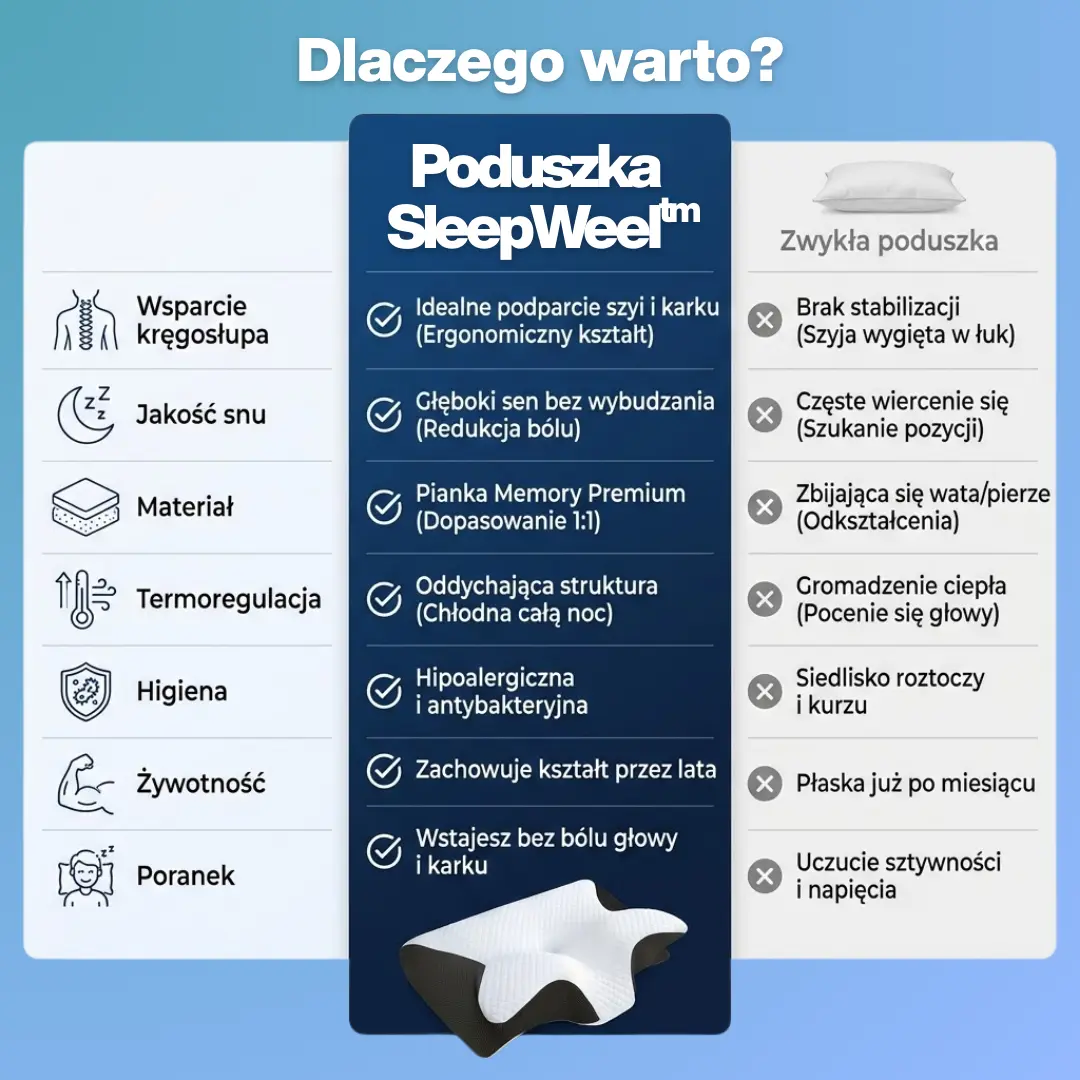 Czy naprawdę chcesz tracić ten czas na walkę z niewygodą? Poduszka SleepWell to gwarancja, że będziesz wstawać z energią, a nie z potrzebą „rozruchu”. Pozbądź się uporczywych bólów napięciowych i odzyskaj radość z zasypiania. Przestań tolerować przeciętny sen – zasługujesz na regenerację na poziomie premium.